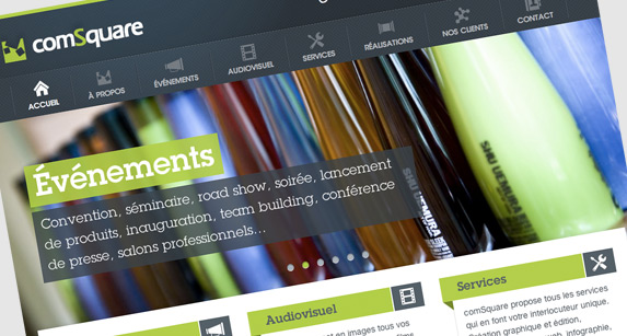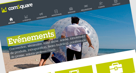 Design graphique du site de la société d’événements et de production audiovisuelle, sur la base d’une page d’accueil.